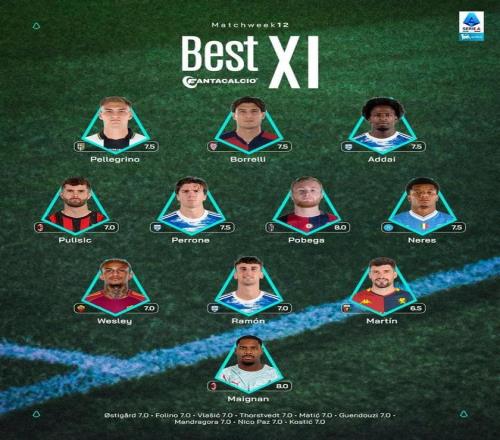 北京时间11月26日,意甲官方选出了联赛第12轮的最佳11人阵容,一攻一防帮助AC米兰赢得米兰德比的普利希奇和迈尼昂领衔,此外那不勒斯的内雷斯和罗马的韦斯利-利马也都榜上有名。