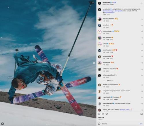 此外,Armada 在社媒上非常善于利用“局部叙事”强化文化氛围。例如,它会在 Reels 推出系列短片,用固定主题贯穿不同滑手的片段,让品牌在视觉上形成统一调性;也会配合雪季节奏推出“early season”“powder day”“park laps”等标签,让用户在看到这些内容时自动联想到雪季开始的兴奋感,从情绪上被拉入滑雪的文化氛围中。