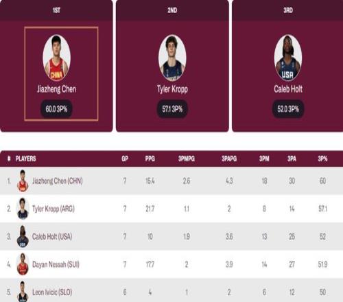 陈家政在U19男篮世界杯上,陈家政场均得到15.4分3.0篮板2.1助攻1.1抢断,投篮命中率60.3%,三分命中率60.0%,罚球命中率87.5%。整届赛事,陈家政三分球总计30投18中。他的三分命中率排名第一,是世青赛的三分王。他在世青赛的表现盖过了球队核心张博源。
