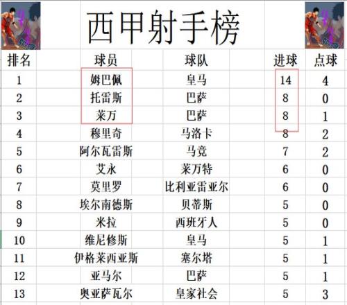 射手榜方面,姆巴佩14球继续领跑,莱万今天本来有机会缩小差距,但是点球都没有罚进。托雷斯打入锁定胜局一球后,倒是追上了莱万,他们和阿尔瓦雷斯并列第2,落后姆巴佩6球。亚马尔没有进球,还是和维尼修斯,奥亚萨瓦尔等人5球刚好挤入前十。