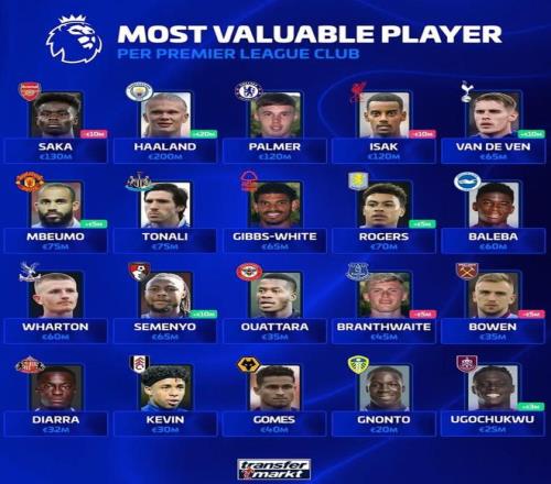 北京时间12月14日,在更新了英超球员的身价之后,德转还统计出了英超20家俱乐部各自身价最高的球员,曼城的哈兰德以2亿欧元的身价领衔,利兹联的尼奥托2000万欧元最低。