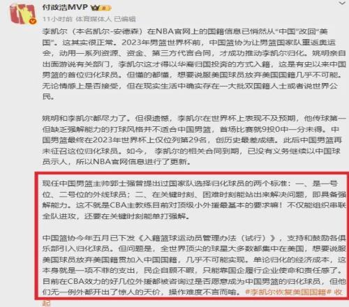 李凯尔目前仍是中国国籍,意味着未来依然有资格代表中国男篮出战FIBA比赛。