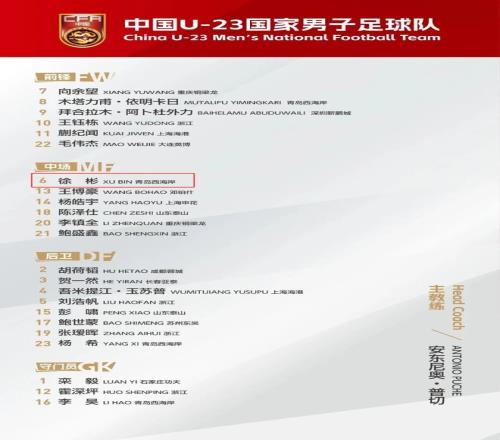 徐彬(前排左一)备战U23亚洲杯。图源:王钰栋R微博