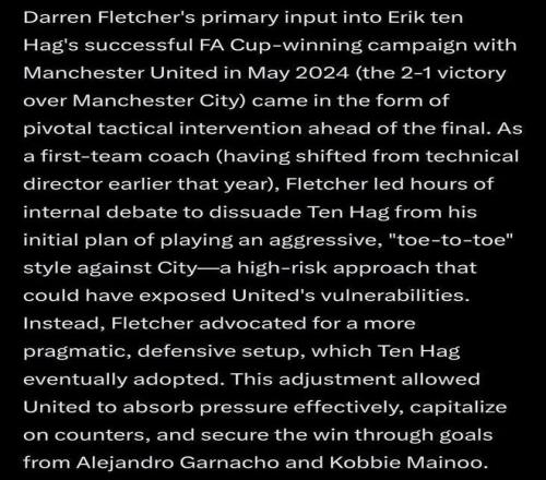 2024年5月的决赛时,弗莱彻从技术总监调任曼联一线队教练。他组织了长时间的内部讨论,说服滕哈格放弃最初打算采用的高位逼抢战术,因为这种打法肯定会暴露曼联的弱点。