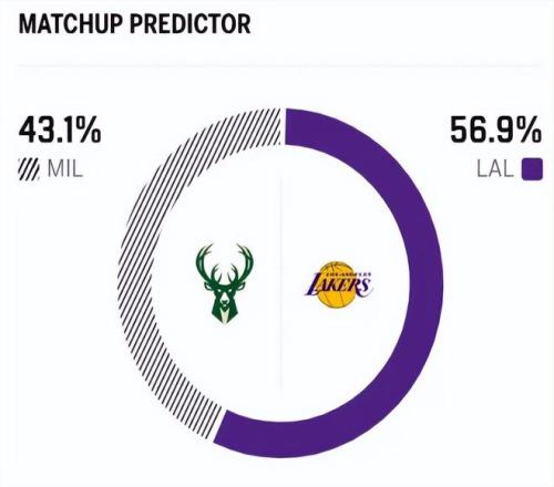 赛前,美媒ESPN对本场比赛进行了胜率预测,湖人队胜率高达56.9%,雄鹿队胜率则仅有43.1% ,差距非常明显。