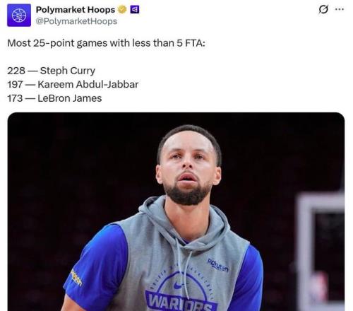 同时这是库里生涯第228场在罚球少于5次的情况下,单场至少拿下25分,继续高居NBA历史第一,贾巴尔以197场排在第二,詹姆斯173场排名第三。