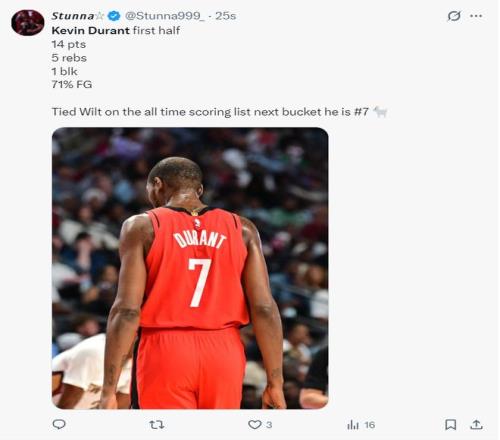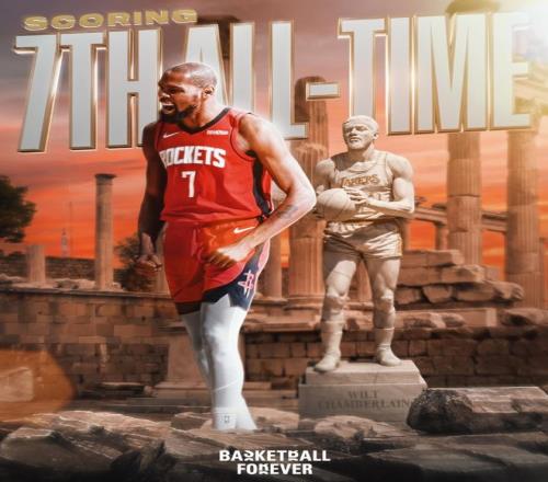 这场比赛杜兰特的得分爆发力没有上一场那么爆炸,因为阿门也有一个不错的发挥。在第二节还剩1分54秒杜兰特后仰命中拿到第14分,他生涯总得分追平了张伯伦升至历史第七位。