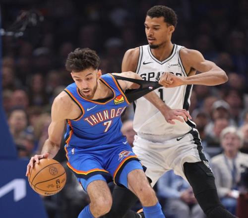 末节,乔命中三分后沃特斯回应三分,文班亚马与霍姆格伦又缠在一起响哨,文班亚马再造犯规裁判看回放没升级,文班亚马两罚一中后被吹进攻干扰球,哈珀三分命中,卡斯尔犯规,凯尔登三分命中缩小到12分,马刺犯满送SGA罚球两罚全中,尚帕尼再来一个三分,卡鲁索反击命中,亚历山大再造犯规两罚全中比赛已经失去悬念。