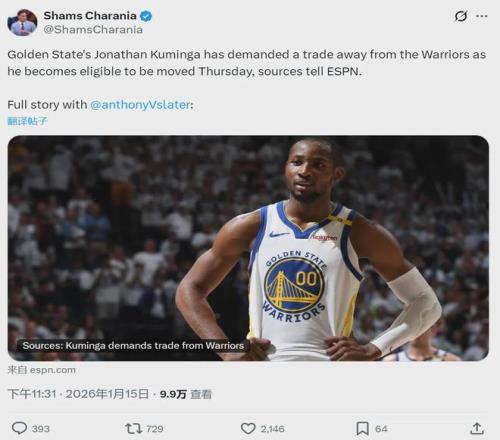 北京时间1月15日晚11点半,据NBA名记Shams报道,库明加正式向勇士队提出交易申请。值得一提的是,今天也是库明加“交易解封”的第一天。跟教主预想的一样,库明加跟勇士迫不及待想分手了,因为他已经连续13场比赛被DNP!