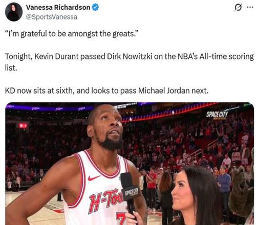 好在决胜时刻对手送上大礼,让杜兰特获得战术罚球机会,最终才拿下第18分,生涯总得分来到31562分,正式超越诺维茨基的31560分荣升NBA历史得分榜第六。