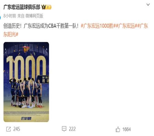 能拿到1000胜来之不易,赛后杜锋也是感慨颇深,表示:这场比赛也是广东队史1000胜,是一个值得纪念的日子,也是值得记住的里程碑。俱乐部成立到现在30多年了,走到现在不容易。在当地政府和广东省体育局的支持下,能持续的成为中国篮球的竞争者,为国家队和国家青年队输送了大量运动员,作为一份子非常自豪。希望球队接下来越来越好,恭喜球队获得CBA第1000场胜利!