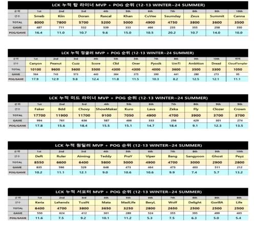 中单位置中,作为英雄联盟传奇选手,Faker以17700分断层领先;场均POG中Chovy与Zeka并列,场均皆为18.4。