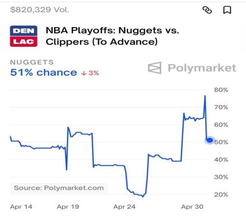 赛后美媒Polymarket更新了系列赛晋级概率,掘金下降3%来到了51%。