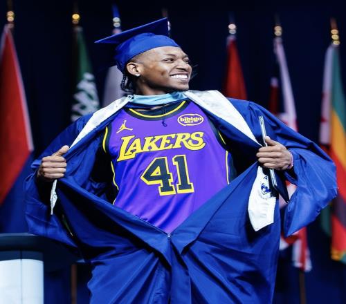在硕士服里面,他将湖人的球衣穿在了身上。