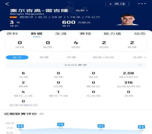 雷吉隆本赛季仅为热刺各项赛事总计出场过六场比赛,获得316分钟上场时间。