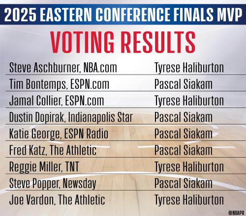 西亚卡姆力压哈利伯顿当选东决MVP,西卡获得5票,哈利获得4票。