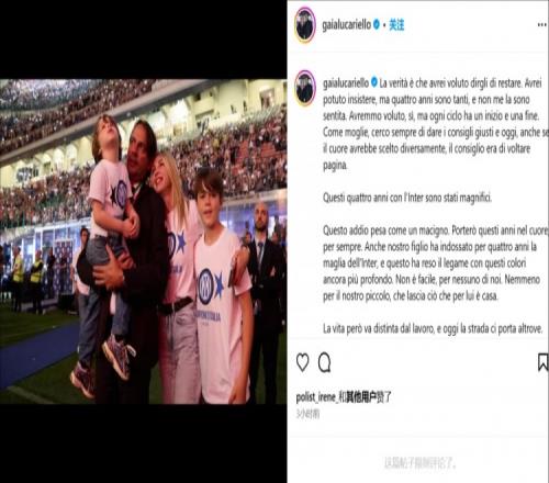“这次告别像一块大石头压在心头。我将永远把这段岁月铭刻在心中。我们的儿子也穿了四年国米的球衣,这让我们与这些颜色的联系更加深厚。这对我们任何人都不容易,甚至对我们的小不点来说也是如此,他也要离开对他来说是家的地方。”