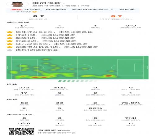对抗方面,维尼修斯9次地面对抗成功4次,被犯规1次,赛后他获得8.2分的媒体评价。