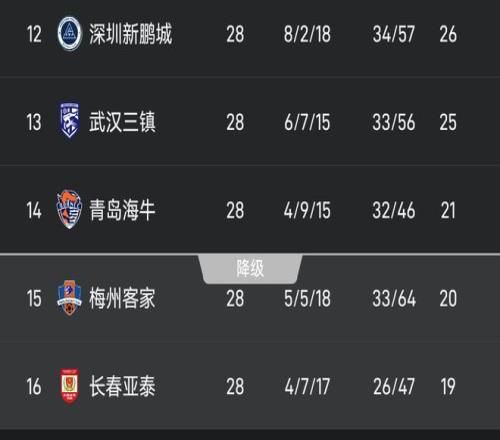 在还剩2轮的情况下,青岛海牛以21分暂逃离降级区,积20分的梅州客家和19分的长春亚泰降级区。