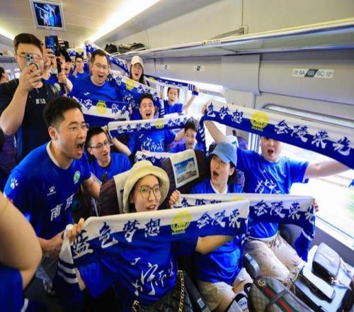 6月14日,球迷们在G9253次列车上合影留念。当日,2025年江苏省城市足球联赛第四轮淮安队对阵南京队的比赛在江苏省淮安市举行,铁路部门开行南京站往返淮安东站的长三角首趟“苏超”球迷高铁专列,方便南京球迷前往观赛。新华社发(苏阳 摄)