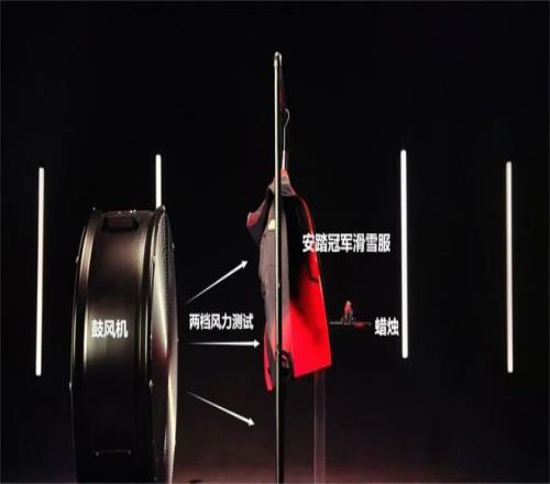 图注:防风测试中,安踏冠军开山雪服V3置于鼓风机与蜡烛之间,半包围护住燃烧的蜡烛