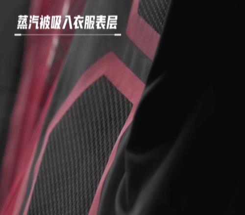 在我们的实验中,用挂烫机产生大量水蒸汽,可以看到蒸汽被吸入背部[1+6]仿生蜂巢透汽阵列,并从后背的透汽窗和腋下拉链高效排出。
