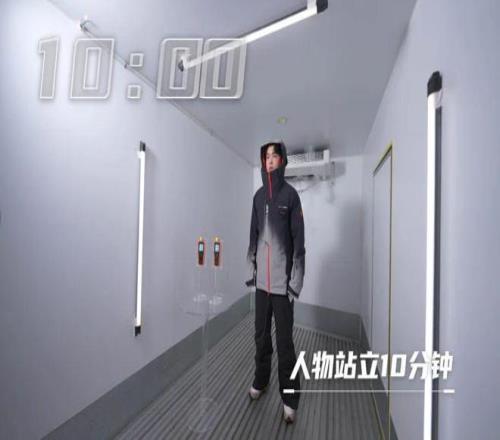 在实验中,由模特穿着安踏冠军滑雪服,站在-20℃的环境中待着10分钟,滑雪服内置的温度计显示温度变化并不大,服装内微环境的温度最终保持在26-28℃。