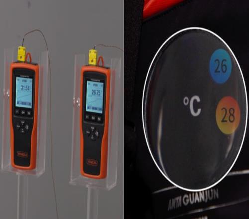 图注:测温仪和衣物内置体温计数值一致,