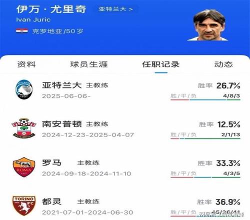 尤里奇在罗马只待了53天,在南安普顿待了106天,如果从六月份官宣之日算起,在亚特兰大待了157天。从热那亚时期的两年三次下课,变成如今的一年三次下课,尤里奇执教生涯的故事实在太多了,不知道将来,他会去哪里?