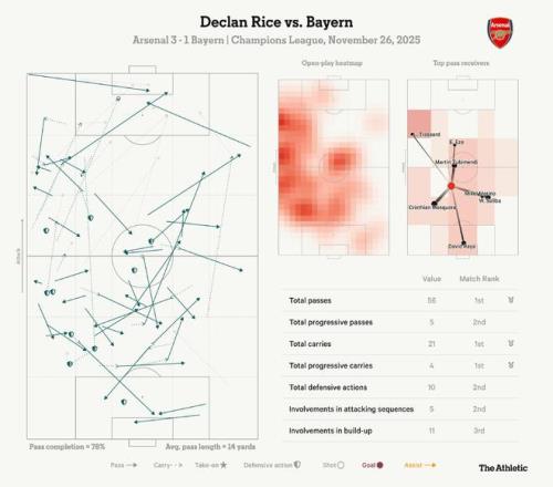 当萨卡被换下时,赖斯接任了队长职务,袖标似乎为他本就勤勉的表现注入了额外动力(如下方他的球员数据图所示)。