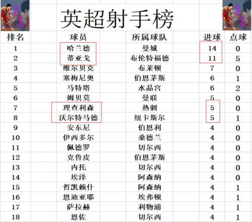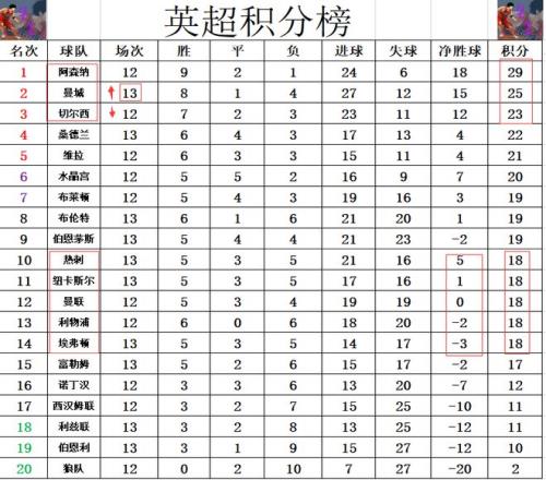 积分榜方面,曼城惊险绝杀击败弱旅后及时止住颓势,暂时超过切尔西升至第2,落后阿森纳4分。热刺今天无力赢球,错失暂时冲进前5的机会,他们现在和今天赢球的纽卡斯尔,曼联,利物浦,埃弗顿同分,热刺排在第10,利物浦排名继续下滑,已经排到第13了。