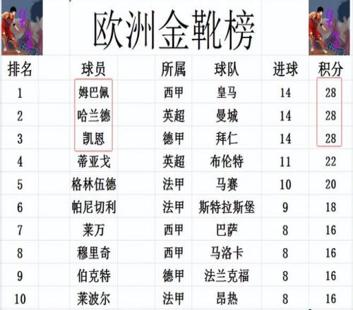 欧洲金靴榜方面,凯恩和哈兰德本轮都没有进球,姆巴佩则是打入一粒点球,这样的话姆巴佩就追上哈兰德和凯恩,三人28分并列第1。蒂亚戈22分排在第4,曼联旧将格林伍德20分排在第5。莱万,穆里奇,伯克特和莱波尔16分刚好挤入前十。前十当中五大联赛只有意甲无人进入,另外意甲也是唯一没有球员进球上双的,要不是劳塔罗本轮怒破5球“大关”,金靴榜前20都没有意甲球员。