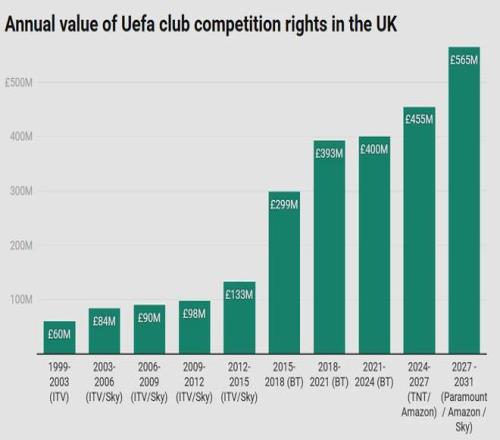 实际上,近年来体育赛事版权交易开出天价早已不是新鲜事,流媒体平台成为掀起这场版权大战的主要玩家。不久前,北美娱乐巨头派拉蒙以超10亿英镑天价,取代TNT体育成为欧冠在英国及爱尔兰的独家持权转播机构,此前德国地区的版权早已落入派拉蒙手中。亚马逊旗下的Prime Video则拥有英国、爱尔兰、德国、意大利四地的欧冠周二晚场赛事首选转播权,而西班牙电信也以14.64亿欧元锁定了2027-2031年欧冠在西班牙的版权。由此,2027-2031周期的欧冠在欧美主流地区的版权即被派拉蒙+(美国、英国、爱尔兰、德国)和Prime两大流媒体平台瓜分,天空体育(意大利版权)、Canal+(法国版权)和西班牙电信(西班牙版权)则维持着传统电视平台在欧冠版权的一席之地。