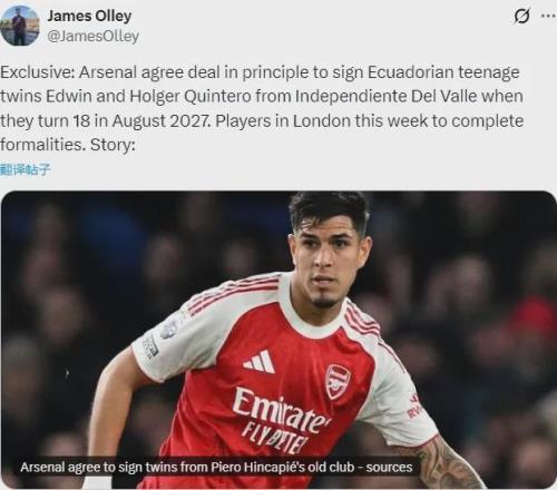BBC也发文报道阿森纳将签约16岁的金特罗兄弟,并且BBC表示两名小将2027年正式加盟后将签下一份5年合同。