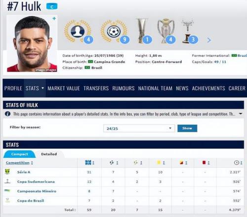 如今39岁的胡尔克,与米内罗竞技的合同也接近尾声,虽然本赛季他在球队的数据表现有所下滑,但依然踢了足足59场比赛,贡献20球7助攻,1人独造27球,甚至绝大部分比赛都是首发出场,而且能打满多数的比赛,身价也还有150万欧元。