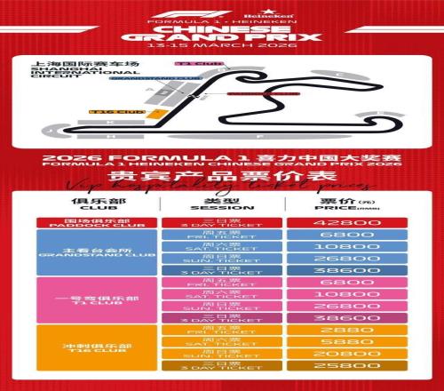 东方网记者汪伟秋12月5日报道:3月13日至15日,2026 FORMULA 1喜力中国大奖赛将在上海国际赛车场拉响引擎轰鸣。今天,官方票价正式公布,票务销售将于12月11日上午11时正式开启。观众可通过下载官方票务渠道久事体育APP,或登录“久事体育APP”微信小程序及支付宝小程序提前做好抢票准备。海外车迷则可通过久事体育APP国际站进行在线选购。