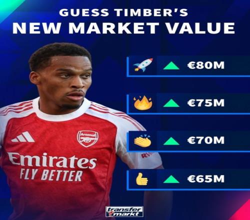 德转预热阿森纳后卫廷贝尔身价上涨,球员身价最低涨至6500万欧,最高8000万欧。