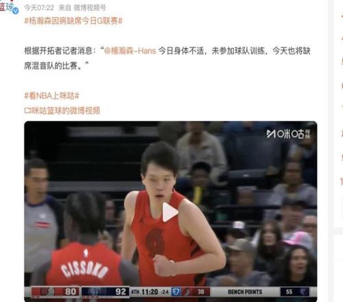 紧接着开拓者的记者又证实了杨瀚森确实因为身体不适没有参加训练,也不会参加发展联盟的赛事。在这样的情况下,球迷就更加担心杨瀚森到底是不是脑震荡了。不过关于目前的这些猜测,我们看到球队的记者已经进行辟谣,表示和灰熊队那场比赛的情况没有任何的关系。杨瀚森只是纯粹的身体不舒服,再加上他透露了球队有一半的人都得了类似的症状,按照这样的情况来看,应该是得了流感,所以大家都身体不舒服。
