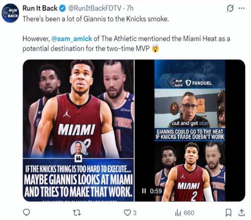萨姆-阿米克在播客节目中谈到,热火是针对扬尼斯-阿德托昆博颇具吸引力的求购对象,如果尼克斯未能追逐扬尼斯成功,大家可以看看迈阿密的做法。