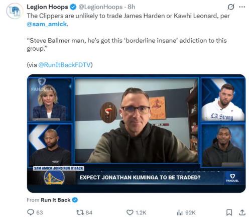 此前有消息称热火有意快船超巨科怀-伦纳德,但北京时间12月10日,TA记者萨姆-阿米克透露,洛杉矶快船不太可能交易哈登、伦纳德,因为鲍尔默对快船有近乎疯狂的执念。