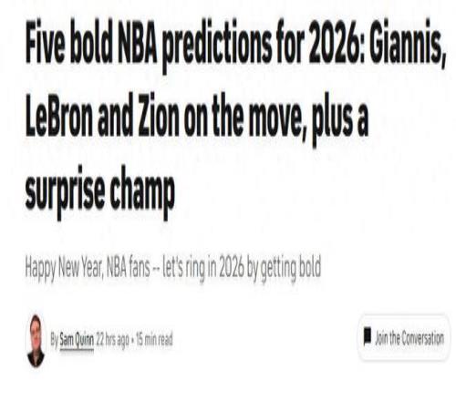 詹姆斯重回骑士!在26年到来之际,美媒《CBS》晒出26年对于NBA的5个大胆预测,其中包括字母哥加盟热火,以及掘金再度夺冠。