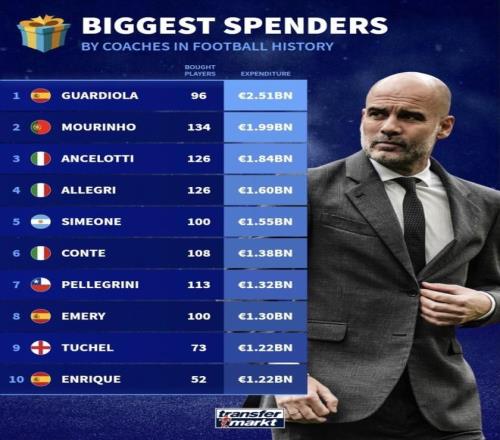 最近德国转会市场发布了“足球史上引援花钱最多的主教练”榜单,瓜迪奥拉、穆里尼奥、安切洛蒂这些熟面孔都在前排。榜单把“买了多少人、花了多少钱”摆得一清二楚,但另一层问题也跟着出来了:花得最多,就一定把钱都换成了最硬的冠军吗?同样是几十亿欧元级别的投入,有的人冠军拿到手软,有的人却做不到,差距一下就出来了。(数据截2025年12月26日)。