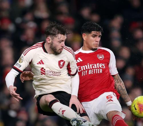 第26分钟阿森纳后防出现巨大失误,阿利森的传球直接送到了布拉德利的脚下,后者也是毫不犹豫,直接起脚吊射,可惜运气不佳,皮球击中横梁被弹出,斯洛特上任之后,利物浦在联赛31次击中门框,同期英超第一,半场结束之前,阿森纳突然发力,连续形成有威胁的进攻,但赖斯和萨卡的打门都被利物浦后防化解,两支球队带着0-0的比分,回到了中场更衣室。