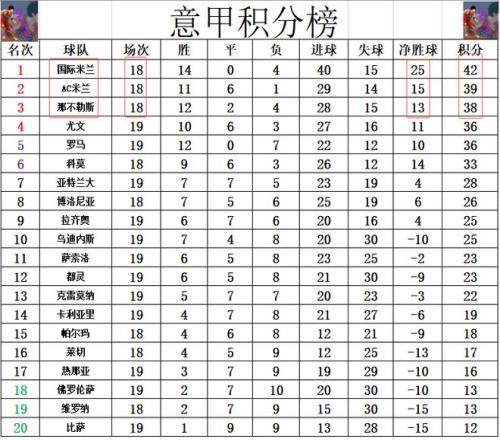 积分榜方面,AC米兰在主场无力拿下保级弱旅,这样的话,他们本轮战罢落后国米3分,由于国米多AC米兰10个净胜球,基本上国米就提前锁定了本赛季的半程冠军。热那亚无缘绝杀,拿到1分的他们比降级区高3分,还是排在倒数第4。