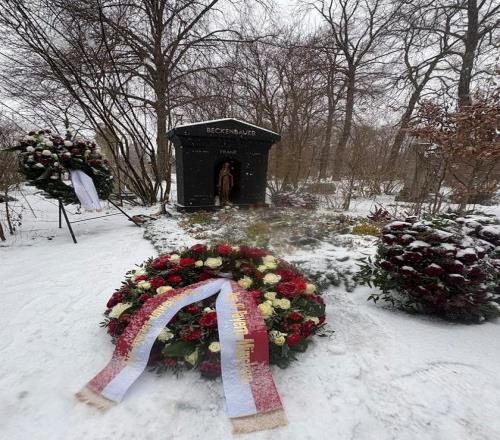 上周三,贝肯鲍尔迎来逝世两周年纪念日。这位德国足协与拜仁慕尼黑的后防传奇人物,同时也曾效力于汉堡和纽约宇宙队,于2024年1月7日在家人陪伴下于家中安然离世,享年78岁。《图片报》在贝肯鲍尔去世两周年当天探访了位于慕尼黑佩拉赫森林公墓的墓地。在巨大的黑色墓碑旁、祈祷姿态的青铜圣母像左侧,摆放着一枚由红白色鲜花组成的新花圈。花圈上的挽联显示献花者为德国足球协会,上书:“谨致崇高敬意——德国足球协会”。