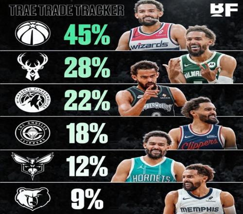 纽约市长特雷杨潜在下家出炉,为什么一支争冠队都没有?最近一段时间特雷杨向老鹰递交交易申请的新闻全网人尽皆知,这头老鹰和特雷杨还没完全分手,那头权威媒体已经列出特雷杨潜在下家清单。