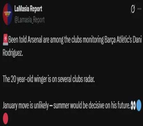 北京时间1月11日,据西班牙媒体《E-Noticies》爆料称,阿森纳主帅阿尔特塔对巴萨B队20岁的边锋达尼·罗德里格斯很感兴趣,而巴萨主帅弗里克已对这笔转会开了绿灯。