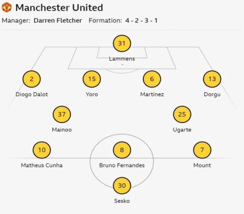 临时主帅达伦·弗莱彻对阵容进行一定轮换,埃登·海文、卢克·肖和卡塞米罗轮休,莱尼·约罗、科比·梅诺和梅森·芒特得以首发,帕特里克·多古回到边后卫位置。弗莱彻的一对双胞胎儿子杰克和泰勒都坐在替补席上。