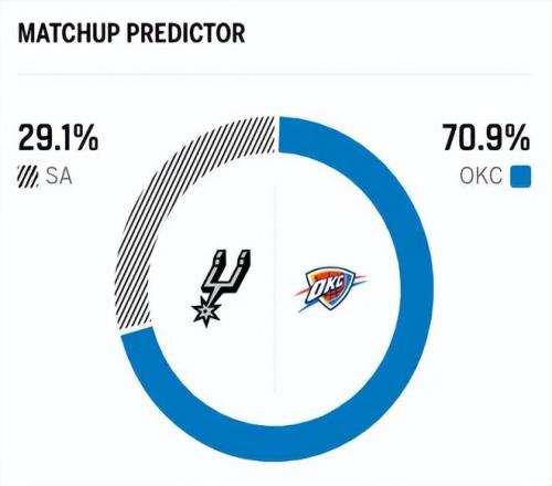 赛前,美媒ESPN对本场比赛进行了胜率预测,马刺队胜率仅有29.1%,依旧不被看好,雷霆队胜率则高达70.9% ,显然美媒都看好雷霆本场能够打破“魔咒” ,完成复仇之战。