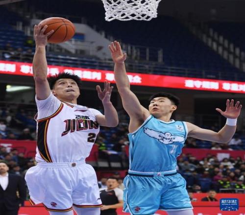 1月15日,青岛崂山啤酒队球员段昂君(左)在比赛中防守吉林长白山恩都里队球员摩尔。新华社记者 李紫恒 摄